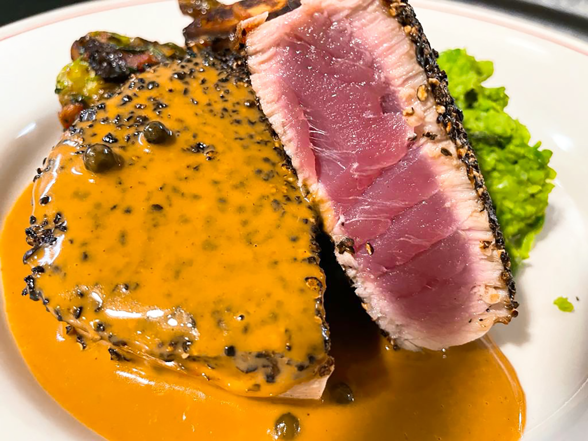 Tuna au poivre $36Black Peppercorn Crusted Ahi Tuna Sauteed Rare, Green Peppercorn Sauce, Triple Cooked Chips