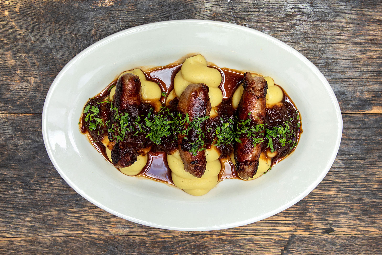 Bangers & MasH $26Myers of Keswick Sausage, Yukon Gold Mashed Potatoes, Onion Gravy